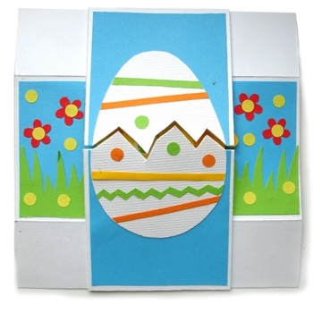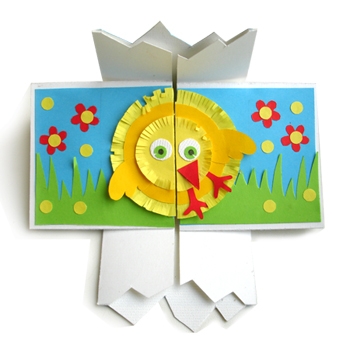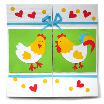 В этой открытке мы использовали пасхальную тему. Курица с петухом — пасхальное яйцо — цыпленок — курица. Наверху размещены только три стороны открытки из четырех.