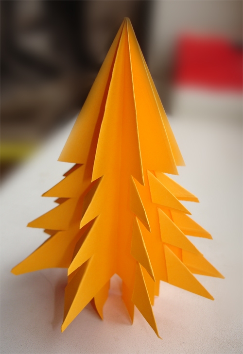 8. Каждый надрезанный полученный прямоугольник загибаем внутрь по диагонали, формируя треугольники. Обязательно делаем в одну сторону на всех гранях елки.Вот, что у вас долж-но было получится