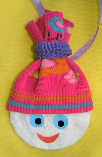 Обведите ватный диск на листе картона и вырежьте из картона круг. Разделите ватный диск на две части и наклейте с каждой стороны картонного круга. Отрежьте кусок носочка для головного убора и наденьте на круг как шапочку. Если резинка сидит плотно, то шапочку можно и не закреплять. Обвяжите носочек резинкой для волос и вставьте ленточку или нитку, за которую игрушку будете вешать на елку. Наклейте глазки и ротик, вырезанные из цветной бумаги.
