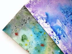 Вот пример раскрашенной бумаги для елочек. Для эффекта снега можно использовать воск, для темных вкраплений мы применяли соль, насыпая ее на влажный закрашенный лист.